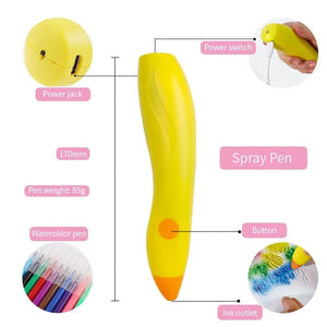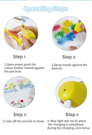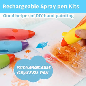 Kids Electric Graffiti Pen Set Magic Spray Washable Art Painting Markers Airbrush BlowPen Rechargeable 4 Stencils Doodle Drawing