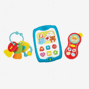 Includes 1 tablet with buttons that emit songs and colored lights, 1 mobile with buttons, lights and sounds and 1 teether keychain